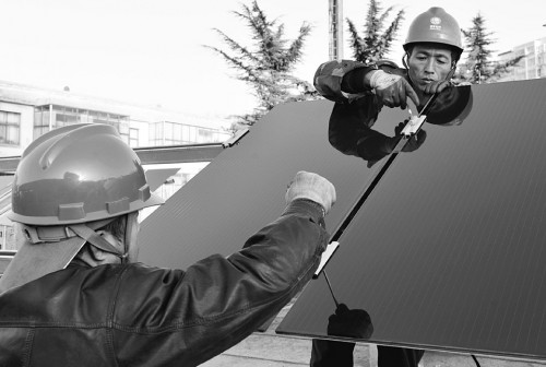 12月2日,安裝技術(shù)人員正在固定光伏板。