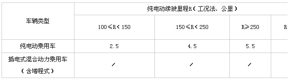 1、純電動乘用車100km≤r<150km每車2.5萬、150km≤r<250km每車4.5萬、r≥250km每車5.5萬元。