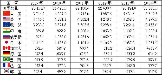 根據(jù)BP公司《世界能源統(tǒng)計(jì)評(píng)述》,從2009年至2014年的六年間,電力消費(fèi)增加了17%,而中國增加了52%,美國只增加4%。由于中國的經(jīng)濟(jì)快速發(fā)展,在2011年發(fā)電量已經(jīng)超過美國,成為世界上最大的電力生產(chǎn)國(見表1)。