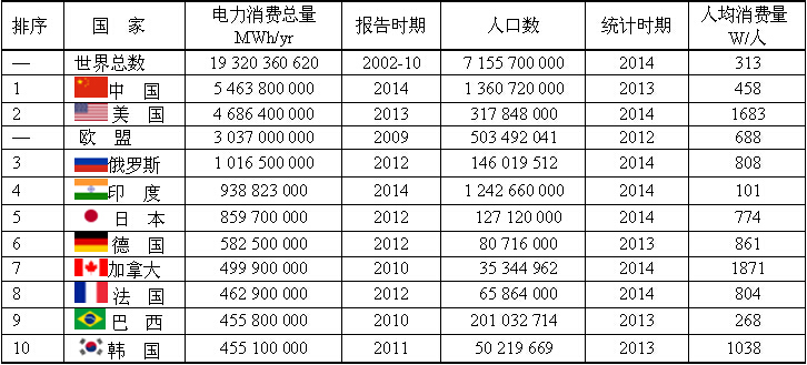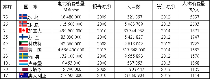 根據(jù)美國中央情報(bào)局《世界統(tǒng)計(jì)年鑒》報(bào)道的各國電力消費(fèi)。中國人均電力消費(fèi)量高于世界平均水平,但美國比中國高出3倍半(見表2)。人均電力消費(fèi)最多的國家是冰島、挪威和加拿大(見表3)。表中“排序”是按照電力消費(fèi)總量排序的。