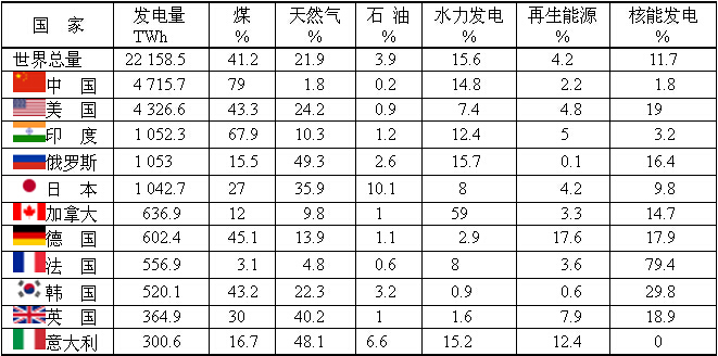 電力生產(chǎn)結(jié)構(gòu)是根據(jù)各國所處的地理位置和國際貿(mào)易所決定的。根據(jù)WB報(bào)告2011年電力生產(chǎn)的來源,全球仍以燃煤發(fā)電為主,中國最多,燃煤發(fā)電占79%,而法國則以核能發(fā)電為主,占發(fā)電總量的79.4%,俄羅斯以燃?xì)獍l(fā)電為主,占49.3%。