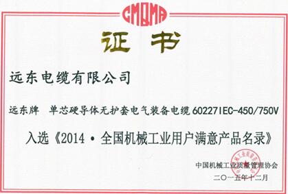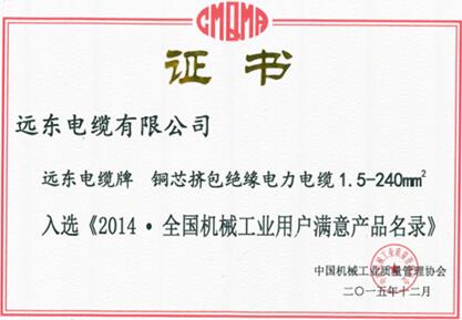 近日,由中國機械工業質量管理協會主辦的"全國機械工業用戶滿意產品"評選活動結果出爐,遠東電纜有限公司的"遠東"牌單芯硬導體無護套電氣裝備電纜和"遠東電纜"牌銅芯擠包絕緣電力電纜1.5-240mm2榜上有名。