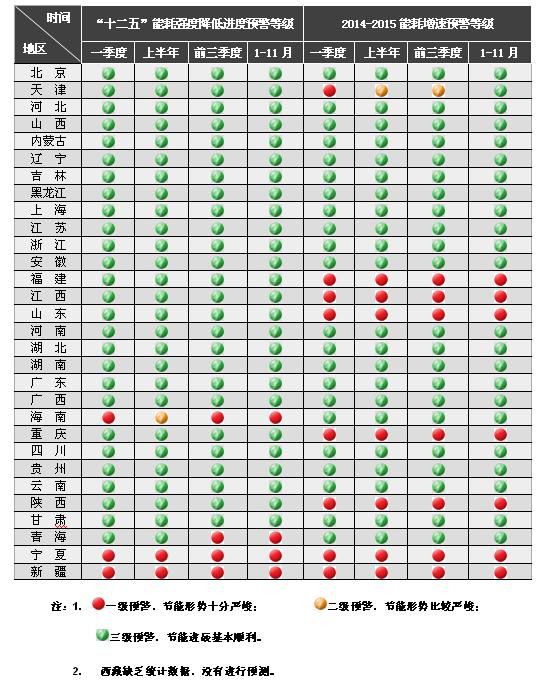 依據國務院辦公廳《2014-2015年節能減排低碳發展行動方案》能耗增速控制目標要求,福建、江西、山東、重慶、陜西、寧夏、新疆等7個地區預警等級為一級;北京、天津、河北、山西、內蒙古、遼寧、吉林、黑龍江、上海、江蘇、浙江、安徽、河南、湖北、湖南、廣東、廣西、海南、四川、貴州、云南、甘肅、青海等23個地區預警等級為三級。