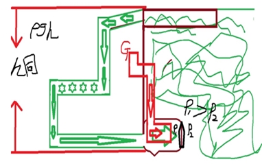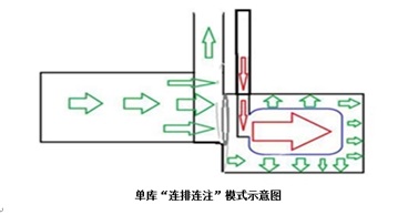 【06】本模式的特征之五,連排連注模式使水庫系統的排水速度遠遠大于注水速度。請參看單庫連排連注示意圖。進氣方向(紅色箭頭)可以與注水方向保持完全一致,順流而擊,這樣一來,只要保持一定節奏感和固定頻率的打擊就行了。水庫一滿,稍稍向上溢出,打擊型動力模式立即打擊,一點兒不會耽誤連續注水,并且排水速度遠遠大于入水速度。這是本模式的一個非常重要的特征。也就是說,本模式的核心之一在于它有一個巨大的“胃口”,即使有很多最大規模的水輪機相加在一起,都難以滿足它超強的排水能力。本人算過,即使按長江千流入海這樣的入海水量計算,都需要好幾個小時。這是本模式能夠成功的一個最重要特征。