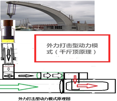 【24】本模式的特征之二十三,外力打擊型動力模式又叫注射器排水模式,其原理與注射器原理基本相同,將儲存水道的水瞬間被打擊撞向海底水庫,將水庫的存水排向庫外,在回收過程當中,又通過系統回收力和水庫水量的排擠力將工作介質(水,或油,或氣體等)如數收回注射器管內,如此重復這一過程,便可以完成外力打擊排水入海。