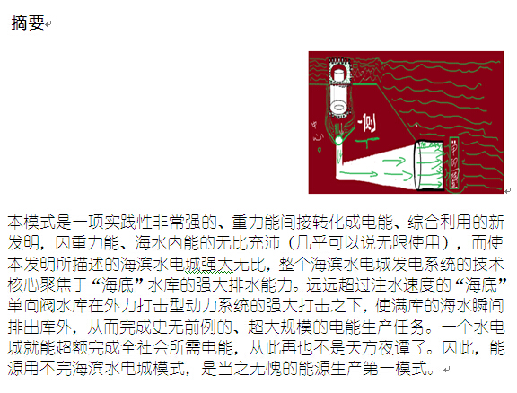 【01】本模式名叫能源用不完模式,曾用名海濱水電城模式,李道東正規軍發電模式等,是以能量守恒定律、能量轉換平衡定律為基礎,將海洋水充分利用,將海洋水內能轉化成重力勢力、動能,進而轉化成機械能,由機械能轉化為電能的能源生產模式。