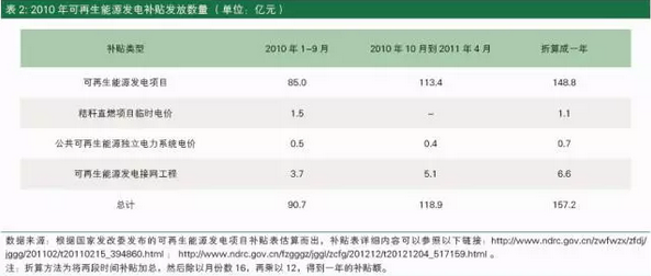以2010年為比較年份。圖1顯示,2010年的電價(jià)附加征收額為154億元。表2顯示,折算后的2010年可再生能源發(fā)電項(xiàng)目補(bǔ)貼為157.2億元。二者之間基本一致,可以說2010年可再生能源發(fā)電項(xiàng)目補(bǔ)貼基本沒有缺口。