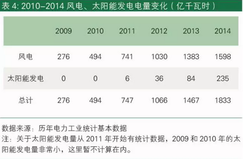 十二五期間,中國的可再生能源電力發(fā)展迅速。根據(jù)表4,風(fēng)電和太陽能發(fā)電量從2010年的494億千瓦時(shí),增加到2014年的1833億千瓦時(shí),五年內(nèi)增加了270%。根據(jù)表2所顯示的補(bǔ)貼額,相應(yīng)于發(fā)電量的增加,電價(jià)附加也應(yīng)有相應(yīng)幅度的增加,才能滿足補(bǔ)貼的需要。