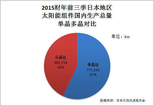 另外,從生產供應上來看,單晶組件也在日本國內也占絕對的主流地位。根據日本太陽光發電協會的統計數據(下圖),2015財年前三季(第四季未統計)日本國內單晶組件生產總量達到771532kw,占比57%,遠超多晶43%。可以看出,日本對單晶組件的重視是要大于多晶組件的。