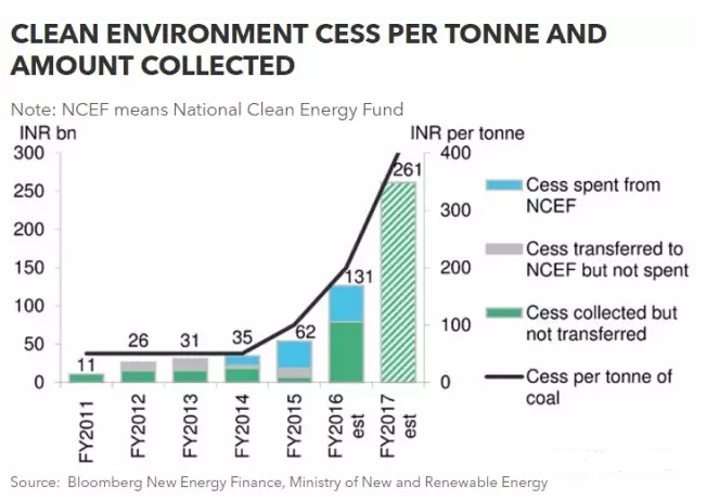 ˙過去六年,印度財政部對國產和進口煤炭以噸為單位征收碳稅,這一政策已創收2820億盧比(41億美元)。但這部分收益目前僅支出了1000億盧比(15億美元),并且大部分用于填補年度預算缺口。