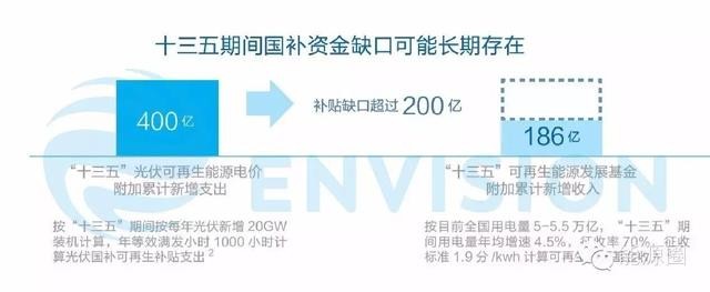 根據(jù)遠(yuǎn)景能源阿波羅光伏的初步測(cè)算,“十三五”期間僅光伏新增裝機(jī)所需的補(bǔ)貼就達(dá)到400億元,而同期社會(huì)新增用電量帶來(lái)的可再生能源基金新增收入只有186億元,在不考慮存量缺口的情況下,又增加了新的資金缺口。
