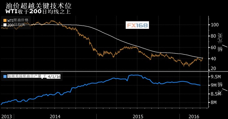 因美國原油產量繼續下降,美國基準原油價格(WTI)周二(4月12日)盤中曾一度刷新每桶42.25美元的去年11月來最高位,同時也是自2014年7月以來首次突破200日均線。此外,標普500能源指數也將在2014年9月以來首次突破200日均線。