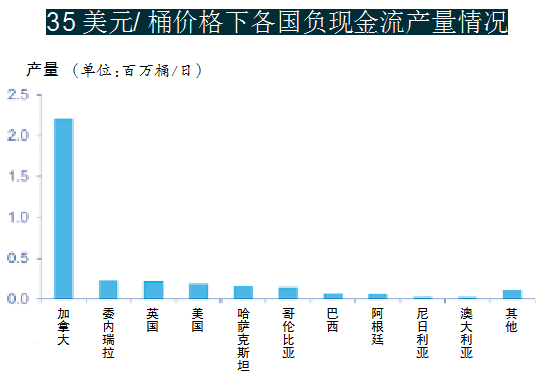 油價為35美元/桶時,加拿大有220萬桶/日的石油都達到負現金流經營成本(主要是油砂及艾伯塔省和大不列顛哥倫比亞省的常規井)。委內瑞拉次之,有23萬桶/日重油出現負現金流經營成本,隨后是英國的22萬桶/日和美國的19萬桶/日。油價低于30美元/桶時,致密油生產開始出現負現金經營成本。