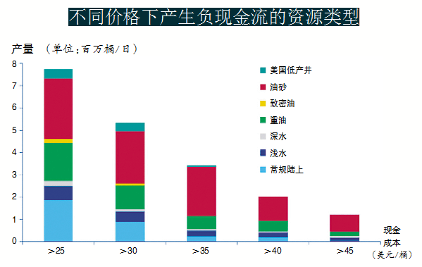 伍德麥肯茲對其掌握的油田數據進行了現金經營成本計算(即油田進入負現金流時的價格和與該價格水平相關的石油產量),其有全球1萬口在產油井數據,液態烴日產量為7970萬桶。計算結果表明,布倫特油價降至50美元/桶時,石油生產已經開始感受到經濟壓力;布倫特油價為40美元/桶時,約200萬桶/日產量為負現金流,占全球總石油供應量的2%以上;布倫特油價為35美元/桶時,約340萬桶/日產量為負現金流,占全球總石油供應量的3.5%;布倫特油價為30美元/桶時,約530萬桶產量為負現金流,占全球總石油供應量的5.5%以上;布倫特油價為25美元/桶時,約770萬桶產量為負現金流,占全球總供應量的8.1%以上。
