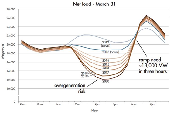 我們可以從這一著名的“鴨型曲線”中看出加利福尼亞州的用電情況。加州用電高峰發生在一天中的早晨和晚上兩個時段。隨著越來越多太陽能發電設備的出現,該地區9點后白天時段的用電量大幅下降。但電力公司必須要讓發電廠和輸電系統做好充足準備,以應對晚間迅速到來的用電高峰,而太陽能電力在這個問題上無能為力。難怪電力公司會如此發愁。