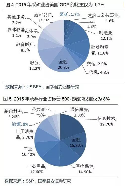 對于石油和股市所表現出的高度正相關性,有觀點認為是由于能源股受到油價正面影響所致,但是2015年采礦業(包括石油、天然氣和礦產開采)占美國GDP總量的比重僅為1.7%,而能源行業股票市值占標普500指數總市值的比重也僅為8%,因此我們認為,油價變動事實上很難通過能源股來撬動巨大的美國整體股市。
