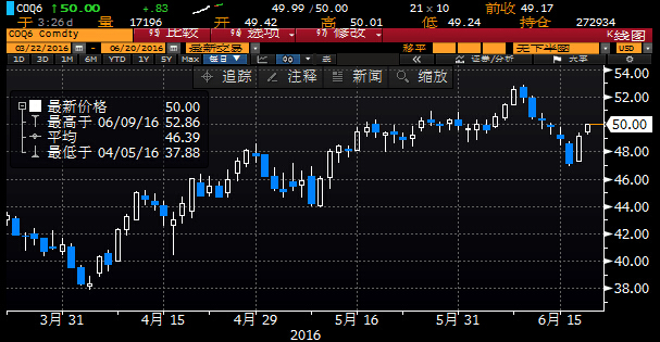 周一(6月20日)亞歐時段國際油價震蕩上漲,美原油8月期貨一度刷新四日高點至49.44美元/桶,布倫特原油8月期貨一度上探50美元關口,美元走軟且市場對于英國可能退出歐盟的疑慮緩解,蓋過了美國原油鉆井數的增加的影響,幫助支撐油價。