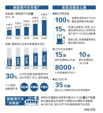 《意見》提出,建設(shè)鄭州新能源客車、純電動(dòng)乘用車以及智能網(wǎng)聯(lián)汽車制造基地。2016年新能源汽車產(chǎn)能8萬輛以上,到2020年,形成國內(nèi)重要的新能源客車、純電動(dòng)乘用車制造中心。