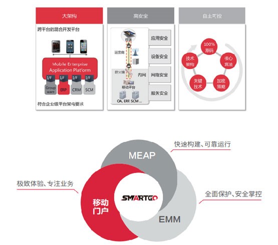 從官方資料看,SmartGO包含三個(gè)部分:MEAP、EMM、移動(dòng)門戶;SmartGO.MEAP提供了基于HARP混合開發(fā)框架,解決的是我們常說的跨平臺移動(dòng)應(yīng)用開發(fā)問題。而對于企業(yè)常見的各業(yè)務(wù)系統(tǒng)集成問題。SmartGO.MEAP提供了超過10種連接器,能便捷的與各類后臺業(yè)務(wù)系統(tǒng)集成,并能夠在高并發(fā)、大數(shù)據(jù)量訪問的同時(shí)保障穩(wěn)定、可靠的運(yùn)行。