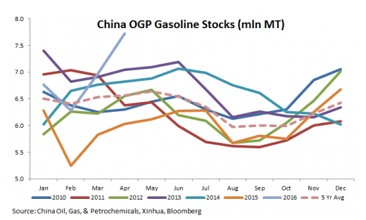 隨著中國原油及制品的進口量遠超過實際需求,中國的汽油庫存也升至創(chuàng)紀錄高位。換言之,全球過剩不僅在原油和餾分油層面,也波及到全球汽油庫存。