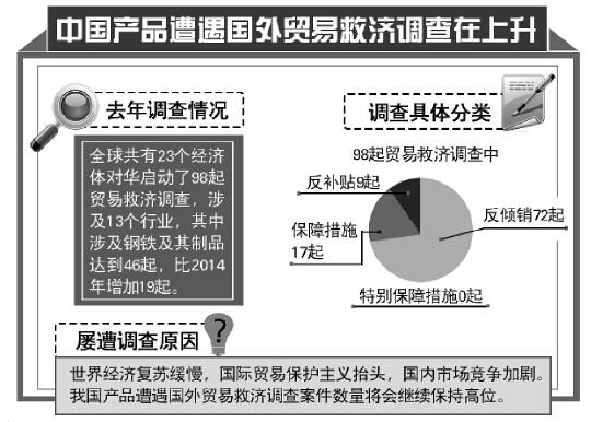 2016年《二十國集團(tuán)(G20)經(jīng)濟(jì)熱點(diǎn)分析報(bào)告(2016-2017)》發(fā)布會今天在京召開。記者從會上獲悉,2015年,全球共有23個(gè)經(jīng)濟(jì)體對華啟動了98起貿(mào)易救濟(jì)調(diào)查,涉及13個(gè)行業(yè),尤其以鋼鐵及其制品行業(yè)最為集中,達(dá)到46起,占比46.9%,比2014年增加19起。
