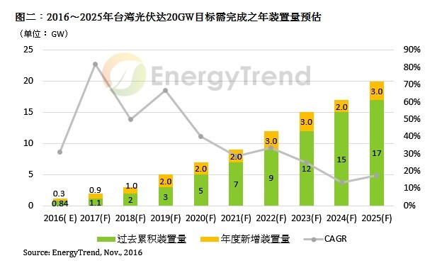 EnergyTrend分析師蔡旻純指出,截至2016年八月止,臺灣光伏累積裝置量為980MW,過去一年半內(nèi)每月平均裝置量不超過20MW,要達成2025年累積裝置20GW的目標,不啻為重大挑戰(zhàn)。