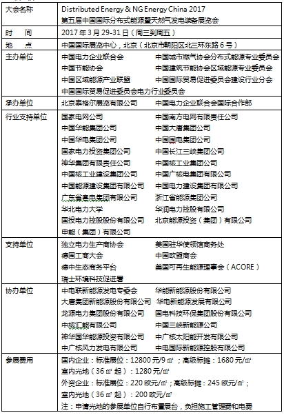 分布式能源技術是未來世界能源技術的重要發展方向,它具有能源利用效率高,環境負面影響小,提高能源供應可靠性和經濟性的特點。為助力我國分布式能源產業發展、力推天然氣發電技術,中國電力企業聯合會、中國城市燃氣協會分布式能源專業委員會、中國節能協會、中國建筑節能協會區域能源專業委員會、中國區域能源產業聯盟、中國國際貿易促進委員會建設行業分會、中國國際貿易促進委員會電力行業委員會于2017年3月29日至31日在北京•中國國際展覽中心共同主辦—2017第五屆中國國際分布式能源暨天然氣發電裝備展覽會,英文簡稱:Distributed Energy & NG Energy China 2017。會期隆重舉辦China Power 2017 中國清潔電力峰會暨中國國際天然氣分布式能源產業高峰論壇。本次活動屬于2017中國國際清潔能源博覽會(英文簡稱:CEEC2017)