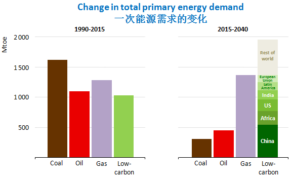 《展望》指出,由可再生能源引領的電力結構轉型把全球能演領域關注的焦點轉移到了電力市場設計和電力安全,而傳統能源安全的擔憂并沒有消失。在未來25年,世界能源需求將持續保持增長,但仍將有幾億人缺乏現代能源。在《展望》的主要情形下,到2040年,全球能源需求將增長30%,這意味著所有現代燃料總量的消費將繼續增長,但是全球總量的增長之下,存在大量不同趨勢以及能源的轉型。