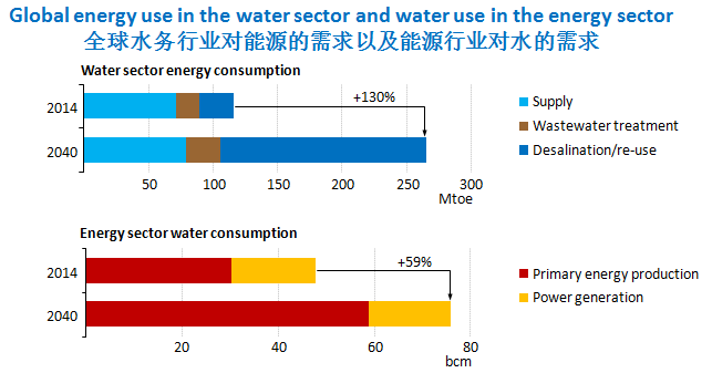 同時,水務行業也越來越多的需要能源。2014年,全球用電量4%用于提取,分配和處理廢水,并且使用5000萬噸柴油用于海水淡化廠。到2040年,水務部門使用的能源量預計還將增加一倍以上。在中東和北非,海水淡化能力急劇上升,對廢水處理(和更高水平的處理)的需求也在增長,特別是在新興經濟體。到2040年,中東16%的用電與供水有關。管理好能源和水的聯系對成功實現發展的范圍和氣候目標十分重要。