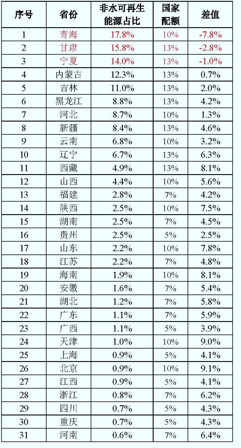 表1:2016年1~11月各省發電量中非水可再生能源占比與國家配額對比
