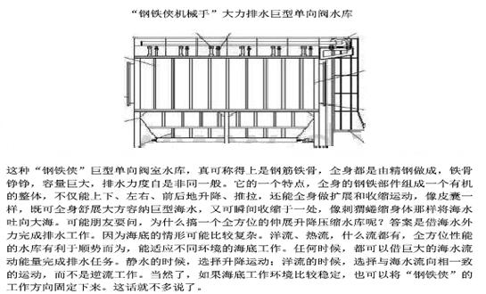 在筆者以前寫過的一篇文章中有一個“鋼鐵俠”機械手,而這里的鋼鐵重拳可以設計成這樣一個模樣,在前面文章中是把這個“鋼鐵俠”當作一個巨量單向閥水庫來看待的,而這里可以把它身上的單向閥功能去掉,想象成一個拳擊手的巨力鐵拳頭。下面圖片就是以前文章所述。(詳見《論千斤頂入海模式改造潮汐能電站》一文,后文有鏈接,見第17頁)當然這個設計還很粗糙,它的細節有待工程師們去進一步完善和改造,供專家讀者思考一番。當然,對于這個夾層彈縮重拳來說,到底是不是必須如我所說要用鋼鐵制造,具體應該如何打造,制造行業的專家們宜好好議論一番。希望制造專家多看看筆者以前介紹的各種各樣的單向閥水庫,相信會獲得靈感。