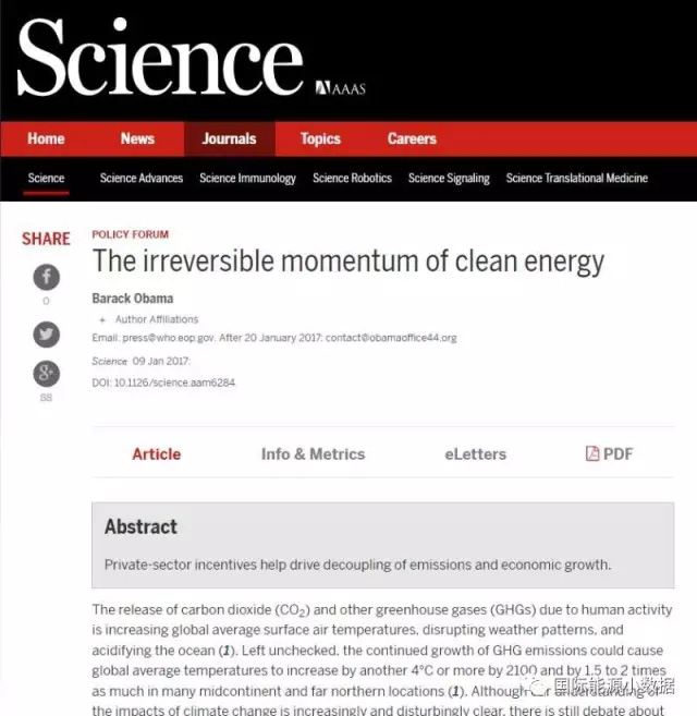美國總統(tǒng)奧巴馬離任前夕在《科學(xué)》雜志上發(fā)表文章:The irreversible momentum of clean energy,引用了各種數(shù)據(jù)證明特朗普無法逆轉(zhuǎn)清潔能源在美國乃至全世界的發(fā)展勢頭: