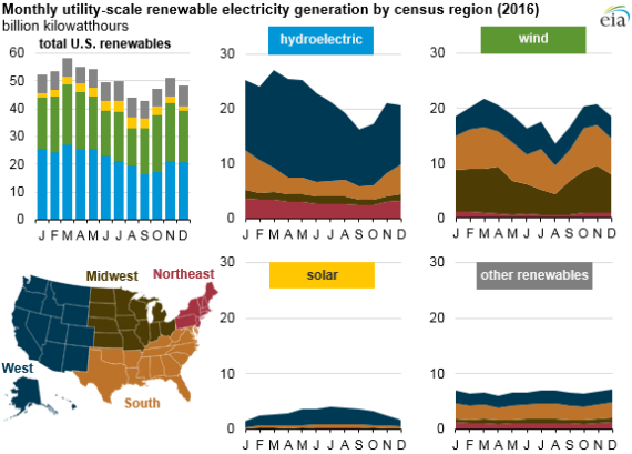 從發(fā)電量來看,今年3月份,美國(guó)可再生能源發(fā)電量達(dá)到全年最高。從地方來看,大部分可再生能源來自西部地區(qū),尤其是水電(占63%)和太陽(yáng)能發(fā)電(占77%)。風(fēng)電產(chǎn)業(yè)相對(duì)發(fā)展比較均衡,中部地區(qū)占37%,南部占35%,西部占24%,東北部地區(qū)占4%。