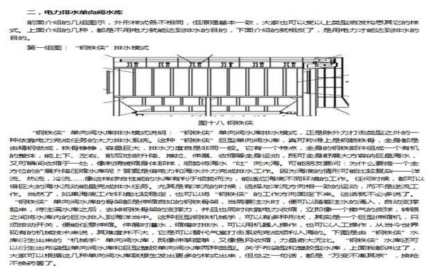 我利用本篇談談前面的一個老話題——電動力排水問題,這個問題以前談過,在《論外力打擊型動力模式與海水輔助排水系統》一文中較為詳細地講過,也曾在2015年7月27日致信周大地老師講這個問題:“鋼鐵俠,當然是必定成功的一種排水模式了,為什么我在課堂并沒有重點介紹呢?主要原因在于它本身消耗電能。而我的能源用不完模式的目標是整個海濱水電城工作流程不用電就能夠完全實現。所以前面并沒有重點介紹它。其實說起它來,也蠻給人類社會提精氣神的:巨大無比,身體能做伸展收縮運動,一會兒像巨型水庫,一會兒像刺猬縮身,吞吐自如,真像科幻小說中的鋼鐵俠……“本文以《再重點談談電動力排水問題》為題,再次重點講講這個問題,能源用不完模式的排水方式表現得更加多元化了。