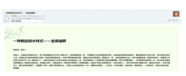 在2015年8月24日筆者就曾給周大地老師去信,講一種新的排水樣式。信中說:“實際上,水底排水有很多種樣式,除了我的前兩篇論文中所介紹的之外,我這里再增加一種。下圖是我介紹過的鋼鐵俠水庫,以前說的還是單向閥排水,靠的是電動力和壓力差,將水庫的水擠壓入海。這里將它改造成由鋼鐵片連成一體的巨型伸縮水庫,本身不具有單向閥功能。隨著注水的不斷增加,像彈性傘一樣,水庫裝滿海水之后,鐵片由橫面連接,瞬間變成側立,就像房門關閉突然變成打開一樣(像自動門),水庫中的海水與水庫外的海水立時融合在一起,其實用電極少(或者用其它彈性裝置原理,根本不需要用電)。然后再像孔雀收屏一樣,側立的鐵片瞬間拉聚回原位(因是側立著拉動,水的阻力很小,用電也很少)再恢復水庫原狀(因是伸縮的,這時處于最小的收縮狀態,當然會很小),再打開進水閘門重新注水。隨著注水加大,水庫不斷變大,最后在彈性相助下,裝滿整個水庫,直到不能再裝為止,又像以上所述的自動門一樣,橫面變成側面……又形成一個排水循環。如此反復,周而復始……這種樣式,我給它起名叫釜底抽薪。”信件見下面截圖。