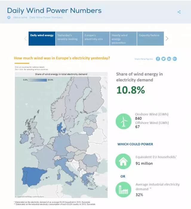 該平臺的第一個模塊顯示,風(fēng)電每天為數(shù)以百萬計(jì)的歐洲家庭和企業(yè)提供電力。去年風(fēng)電覆蓋了歐盟電力需求的10.4%。在一些日子里,在部分成員國則覆蓋了超過100%的電力需求。