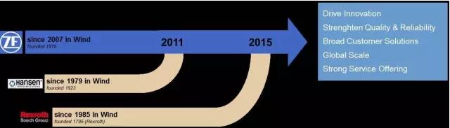 2007年,采埃孚(ZF)憑借其在車輛變速箱領(lǐng)域積累的豐富經(jīng)驗(yàn)開始向Vestas批量供貨風(fēng)電齒輪箱;2011年,收購Hansen;2015年,收購Rexroth風(fēng)電齒輪箱業(yè)務(wù)。
