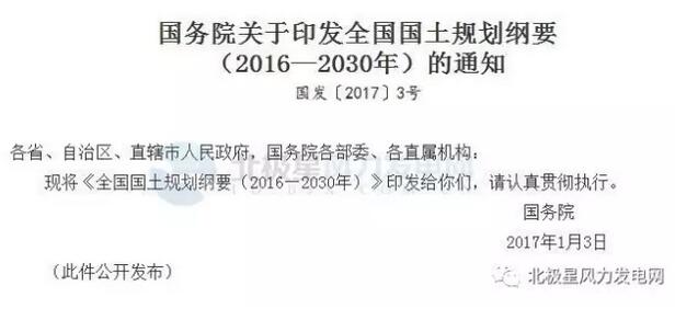 國務(wù)院近日發(fā)布《全國國土規(guī)劃綱要(2016—2030年)》,文件中兩次專門提到了風(fēng)電:有序建設(shè)華北、東北、西北地區(qū)大型風(fēng)電和太陽能發(fā)電項目,加快推進(jìn)海上風(fēng)電規(guī)模化發(fā)展;在保護(hù)生態(tài)的前提下,有序穩(wěn)妥開發(fā)水電,安全發(fā)展核電,高效發(fā)展風(fēng)電,擴大利用太陽能,有序開發(fā)生物質(zhì)能。