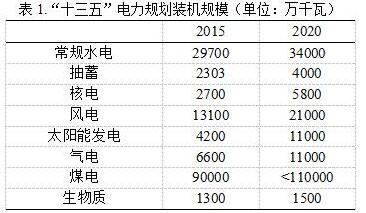 “十三五”期間,全國(guó)常規(guī)水電新增投產(chǎn)約4000 萬千瓦,開工6000 萬千瓦以上,到2020 年,常規(guī)水電裝機(jī)達(dá)到3.4 億千瓦,抽水蓄能電站裝機(jī)新增約1700 萬千瓦,達(dá)到4000 萬千瓦左右;全國(guó)核電投產(chǎn)約3000 萬千瓦,開工3000 萬千瓦以上,2020 年裝機(jī)達(dá)到5800 萬千瓦。2020 年,風(fēng)電裝機(jī)達(dá)到2.1 億千瓦以上;太陽能發(fā)電裝機(jī)達(dá)到1.1 億千瓦以上。“十三五”期間,氣電新增投產(chǎn)5000 萬千瓦,2020 年達(dá)到1.1 億千瓦以上。“十三五”期間,取消和推遲煤電建設(shè)項(xiàng)目1.5 億千瓦以上;煤電裝機(jī)規(guī)模力爭(zhēng)控制在11 億千瓦以內(nèi)。