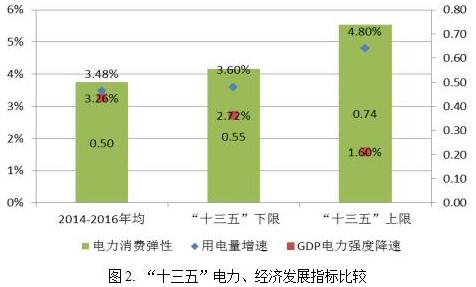 根據(jù)“十三五”規(guī)劃綱要的發(fā)展目標(biāo),“十三五”期間GDP年均增速要保持在6.5%以上,預(yù)計(jì)到2020年,我國(guó)GDP總量將達(dá)到94.4萬億元。結(jié)合電力發(fā)展規(guī)劃目標(biāo),預(yù)計(jì)“十三五”我國(guó)電力消費(fèi)彈性系數(shù)約為0.74。由表2中的數(shù)據(jù)可以看出,以電力消費(fèi)彈性這一指標(biāo)來看,從“十五”到“十三五”,該指標(biāo)一直呈下降趨勢(shì)。然而,“十三五”期間電力彈性能否維持0.74的水平,這仍然是一個(gè)值得深思的問題;也就是說“十三五”期間,年均4.8%甚至更高的用電量增速是值得深究的。