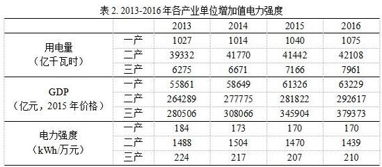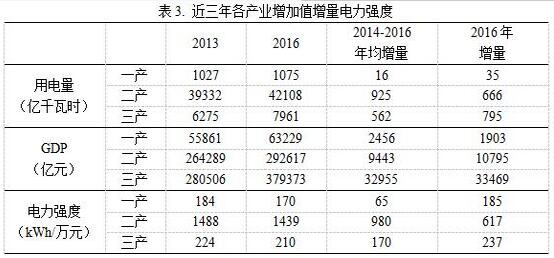 進(jìn)一步,對(duì)三次產(chǎn)業(yè)近三年的增加值增量與用電量增量的關(guān)系進(jìn)行分析。結(jié)果表明,平均來看,各產(chǎn)業(yè)近三年增加值增量部分的電力強(qiáng)度均比對(duì)應(yīng)年份的總體水平低,“二產(chǎn)”尤為明顯,這也與各產(chǎn)業(yè)電力強(qiáng)度持續(xù)下降的趨勢(shì)吻合。