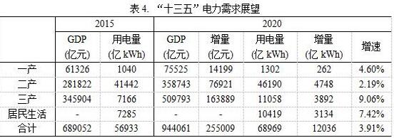 僅從“十三五”的第一年來看,各產(chǎn)業(yè)增加值增量中,第一產(chǎn)業(yè)和第三產(chǎn)業(yè)的電力強(qiáng)度略高于較近三年總體水平,而第二產(chǎn)業(yè)的電力強(qiáng)度要顯著低于近幾年總體水平。隨著產(chǎn)業(yè)結(jié)構(gòu)的進(jìn)一步調(diào)整,高耗能行業(yè)用電量的飽和以及去產(chǎn)能的進(jìn)一步深入,第二產(chǎn)業(yè)電力強(qiáng)度將進(jìn)一步下降,而第一產(chǎn)業(yè)與第三產(chǎn)業(yè)電力強(qiáng)度則相對(duì)穩(wěn)定。預(yù)計(jì)“十三五”期間各年度三大產(chǎn)業(yè)電力強(qiáng)度將會(huì)維持下降趨勢(shì)不變,而其中第二產(chǎn)業(yè)的電力強(qiáng)度將會(huì)出現(xiàn)較明顯的下降。根據(jù)2016年三大產(chǎn)業(yè)增加值增量部分對(duì)應(yīng)的電力強(qiáng)度對(duì)2020年各產(chǎn)業(yè)用電量進(jìn)行了展望,同時(shí)假設(shè)居民用電增速保持“十二五”期間的平均水平。預(yù)計(jì)到2020年全社會(huì)用電量約6.9萬億千瓦時(shí),年均增速約3.91%,具體到產(chǎn)業(yè)來看,第一產(chǎn)業(yè)、第二產(chǎn)業(yè)、第三產(chǎn)業(yè)用電量年均增速分別為4.60%、2.19%、9.06%。