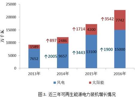 從近三年可再生能源電力裝機(jī)增長(zhǎng)情況來看,風(fēng)電和太陽能裝機(jī)規(guī)模均快速增長(zhǎng),可再生裝機(jī)規(guī)模年均增長(zhǎng)約4500萬千瓦。具體來看,截至2016年,我國(guó)風(fēng)電裝機(jī)規(guī)模1.5億千瓦,近三年年均增長(zhǎng)約2500萬千瓦;太陽能裝機(jī)規(guī)模7742萬千瓦,近三年年均增長(zhǎng)約2000萬千瓦。而根據(jù)“十三五”電力規(guī)劃的發(fā)展目標(biāo),2020年風(fēng)電裝機(jī)在2015年1.3億千瓦的基礎(chǔ)上新增約8000萬千瓦,年均投產(chǎn)僅1600萬千瓦,太陽能裝機(jī)規(guī)模目標(biāo)為1.1億千瓦,新增6800萬千瓦,年均投產(chǎn)僅1360萬千瓦。與近幾年的發(fā)展趨勢(shì)相比,按照規(guī)劃目標(biāo),可再生電力發(fā)展速度卻將明顯放緩。