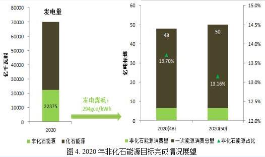 從非化石能源目標(biāo)來看,根據(jù)“十三五”電力規(guī)劃,預(yù)計(jì)2020年我國(guó)非化石能源發(fā)電量為2.24萬億千瓦時(shí)。按照310gce/kWh的供電煤耗目標(biāo)(對(duì)應(yīng)的發(fā)電煤耗水平約294gce/kWh)核算,非化石電力生產(chǎn)對(duì)應(yīng)的一次能源供應(yīng)量為約6.6億噸標(biāo)煤。按照50億噸標(biāo)準(zhǔn)煤的一次能源消費(fèi)預(yù)期目標(biāo)來計(jì)算,電力非化石一次能源占比僅為13.2%,15%的非化石能源占比目標(biāo)料難完成。我們考慮2020年50億噸標(biāo)煤的一次能源消費(fèi)量目標(biāo)可能過于樂觀;但即便是按照較為合理的48億噸標(biāo)準(zhǔn)煤來計(jì)算,電力非化石能源在一次能源中的占比也僅為13.7%,與15%的目標(biāo)仍有較大差距。