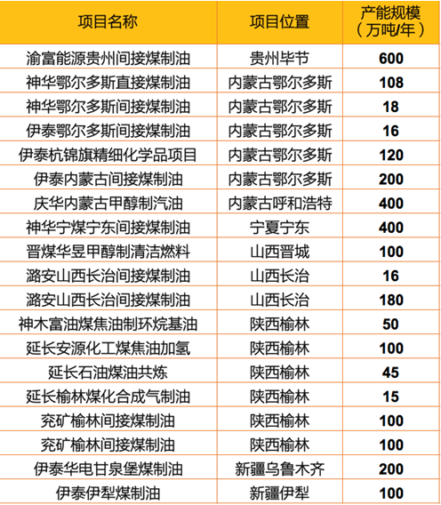 附:表1. 符合十三五規劃的煤制油項目及產能明細(包括已投產的項目)