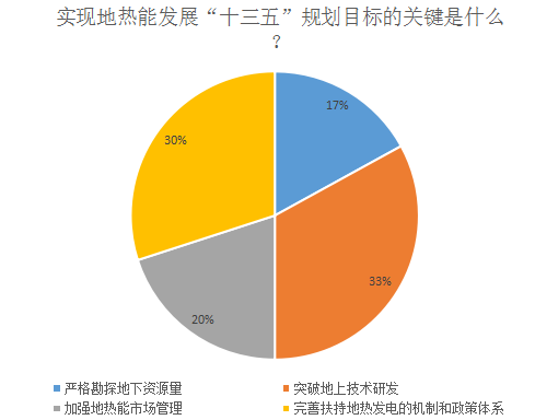 17%的網(wǎng)友認為,應(yīng)該嚴格勘探地下資源量;20%的網(wǎng)友認為,加強地?zé)崮苁袌龉芾砀鼮殛P(guān)鍵;30%的網(wǎng)友認為,完善扶持地?zé)岚l(fā)電機制和政策體系是實現(xiàn)目標(biāo)的必要條件;33%的網(wǎng)友認為,應(yīng)該加速突破地上技術(shù)研發(fā)。
