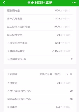 點擊售電利潤計算器,輸入預測用電量、用戶實際電量、雙邊協商月分解電量、雙邊協商價差(與電廠在批發市場年度協商價差)、月度出清結算價等信息就可以測算出售電公司與用戶的利潤狀況了。