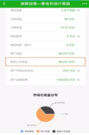 點擊測算后,我們可以看到用戶收益86.375萬元,售電公司收益46.375萬元等信息。該測算結果還可以一鍵分享到微信群和微信好友!