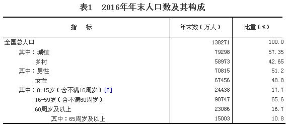 [6]2016年年末,0-14歲(含不滿15周歲)人口為23008萬人,15-59歲(含不滿60周歲)人口為92177萬人。