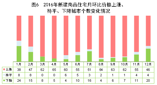 12月份70個大中城市新建商品住宅銷售價格月同比上漲的城市個數為65個,下降的為5個;月環比上漲的城市個數為46個,比年內高點減少19個,持平的為4個,下降的為20個。